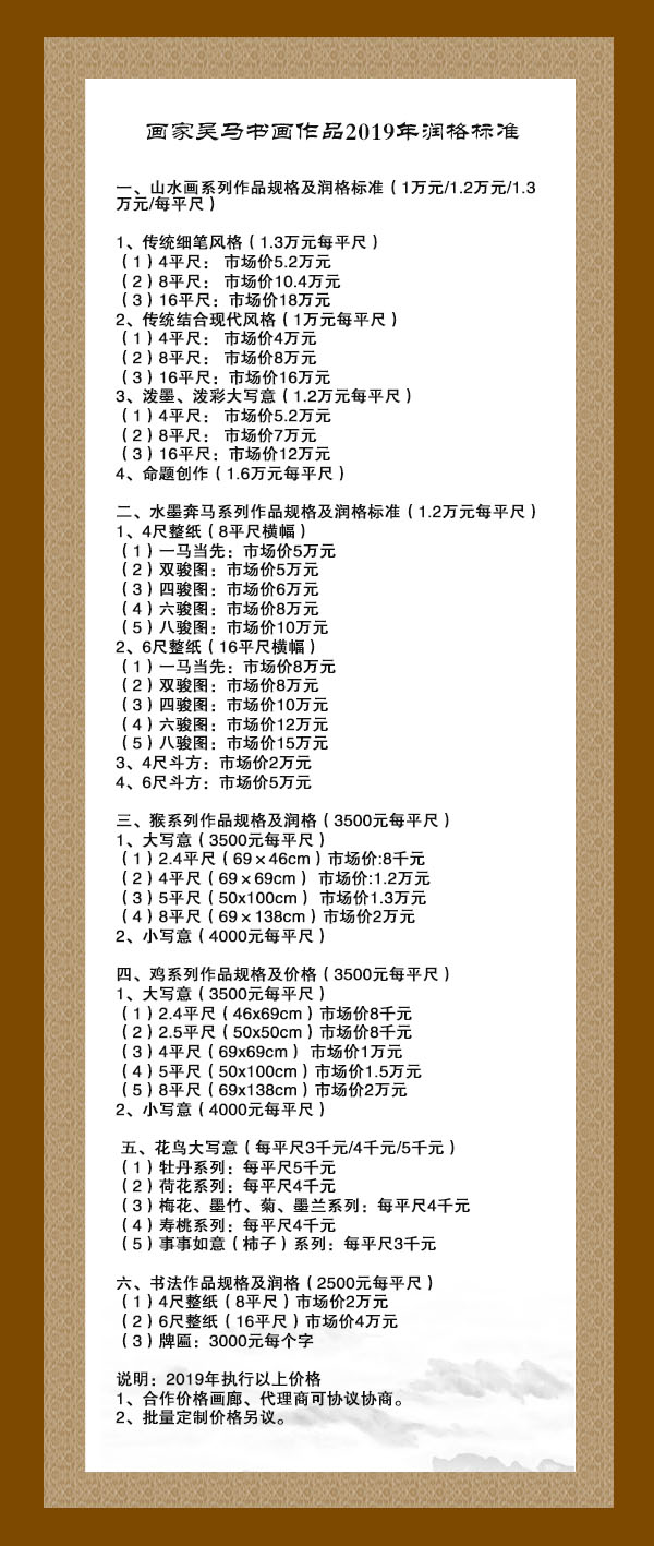 画家吴马书画作品2019年润格标准