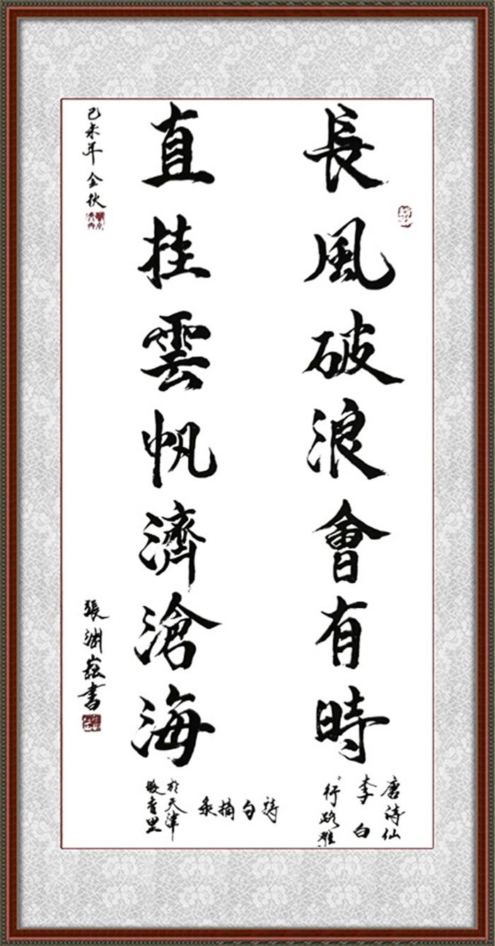 A detailed view of Mr.Zhang's calligraphy works, with the pen fortune and the whole layout stretch and compact suitable to complement each other, wild and cautious complement each other. Its book majestic, knot body steady dignified, pen and ink smooth natural, from the point of pen, structure, clever and not disorderly, brush lines, smooth strokes, with ink shade appropriate, font size change, chic, rigorous structure, not deliberately work and reveal the sense of bold and unrestrained, the word extremely indulgent stretch, body like flowing freely, elegant nature, vigorous, extremely artistic charm. The pen is exquisite, the structure is changeable, the achievement lies in increasing the damage of the ancient method, changing the simple writing style of Han and Wei into the exquisite and beautiful writing style.