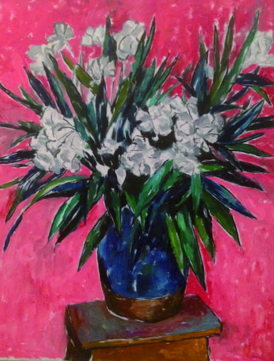 展览现场,一幅《站着的夹竹桃》作为整个展览的开端,而这是丁天缺人生中最后一幅油画作品:一盆丛簇茂盛的夹竹桃花开正艳,庄重的红色背景映衬之下,灰白色调的花儿相互簇拥,少了几分艳丽娇媚,多了一种质朴的美好和生命力。而这似乎正代表着丁天缺先生的人生缩影和艺术态度,在20世纪中国美术史的发展中,他以耿直、低调和质朴的人格魅力,始终在油画色彩传达和生命力表达等方面不断实践,探索着中国现代油画的更多可能性。