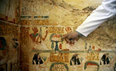 这是在埃及卢克索省尼罗河西岸新发现的古埃及贵族墓葬中的壁画(11月24日摄)。 埃及文物部长哈立德·阿纳尼24日在卢克索省尼罗河西岸的阿萨希夫陵墓群考古现场宣布,埃及考古队在此新发现一座古埃及贵族墓葬。根据目前掌握的资料,墓主人应为尼罗河东岸穆特神庙掌管木乃伊圣殿的官员,属于古埃及第十八、十九王朝时期。